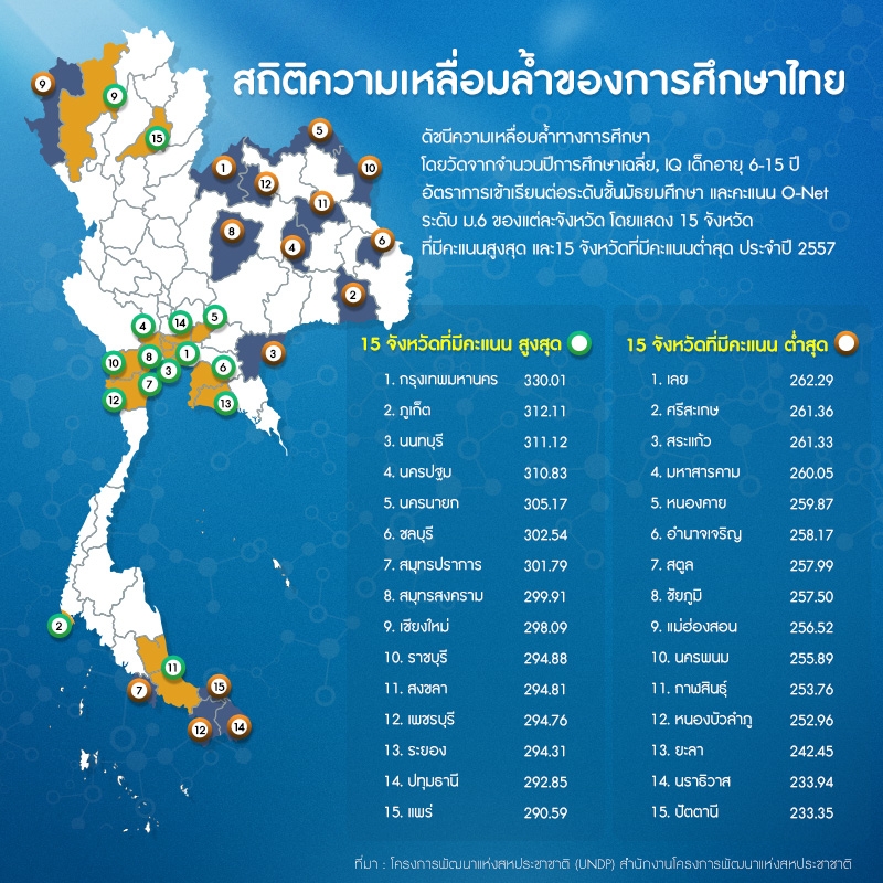 สำหรับประเทศไทยยังมีปัญหาความเหลื่อมล้ำทางคุณภาพการศึกษาอยู่เป็นจำนวนมาก ดัชนีการศึกษารายจังหวัดประจำปี 2557 โดยโครงการพัฒนาแห่งสหประชาชาติ (UNDP) สำนักงานโครงการพัฒนาแห่งสหประชาชาติ ได้สำรวจสถานการณ์คุณภาพการศึกษาของไทยเป็นรายจังหวัดในปี 2557 โดยวัดจากจำนวนปีการศึกษาเฉลี่ย, IQ เด็กอายุ6-15ปี,อัตราการเข้าเรียนต่อระดับชั้นมัธยมศึกษา และคะแนนO-Net ระดับม.6 ของแต่ละจังหวัด ซึ่งพบว่า มีเพียง 15 จังหวัดที่มีดัชนีการศึกษาสูงสุด ได้แก่ กทม. นนทบุรี ชลบุรี เชียงใหม่ พิษณุโลก นครปฐม และภูเก็ต เป็นต้น ที่น่าสนใจคือกลุ่มจังหวัดอยู่ในผลคะแนนระดับต่ำกว่ามาตรฐานมีสูงถึง 33 จังหวัด ส่วนใหญ่อยู่ในภาคอีสานและกลางตอนบน เช่น อุบลราชธานี ชัยภูมิ หนองบัวลำภู กำแพงเพชร แม่ฮ่องสอน รวมทั้ง 3 จังหวัดชายแดนภาคใต้