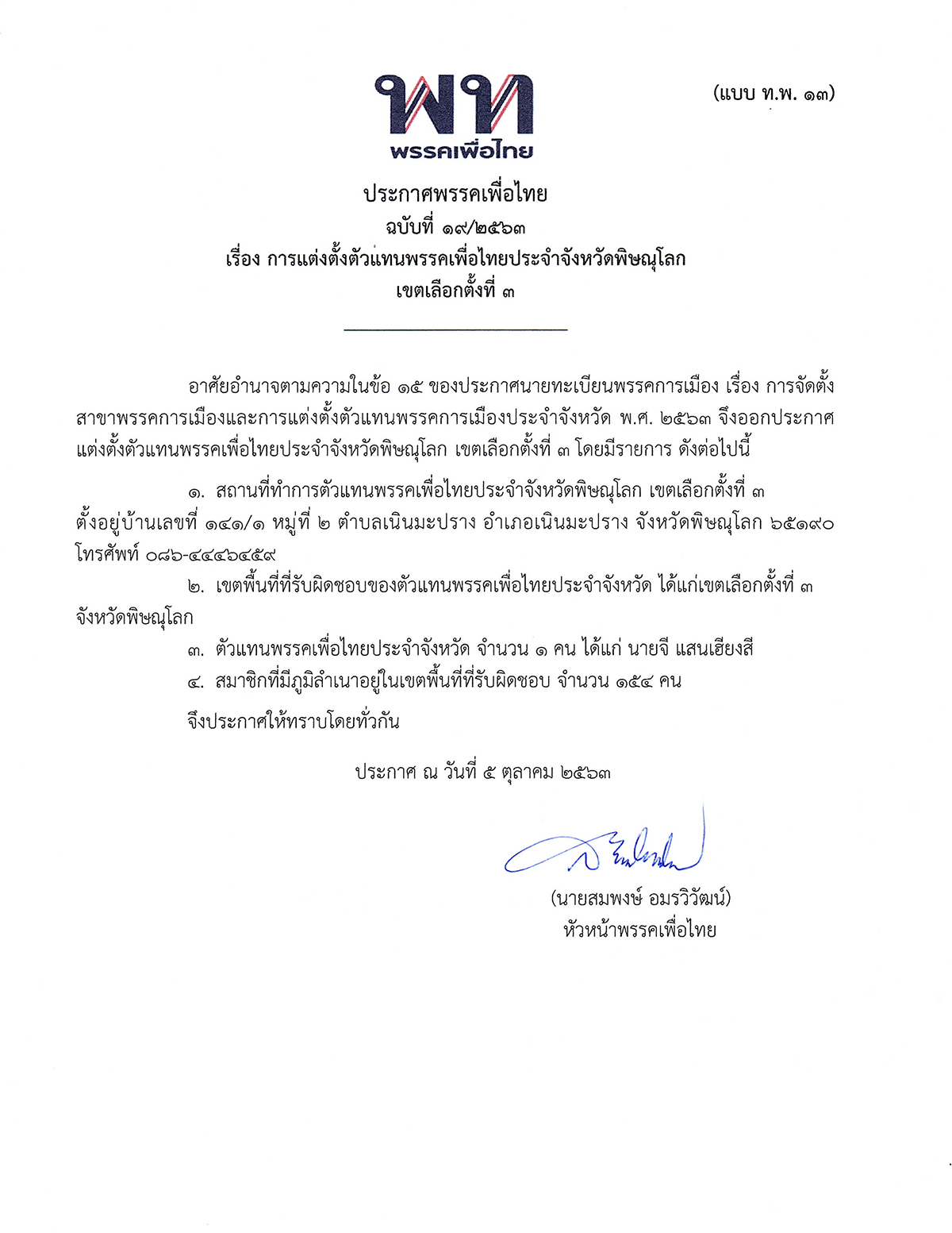 ประกาศพรรคเพื่อไทย ฉบับที่๑๙/๒๕๖๓ เรื่องการแต่งตั้งตัวแทนพรรคเพื่อไทยประจำจังหวัดพิษณุโลก เขตเลือกตั้งที่ ๓