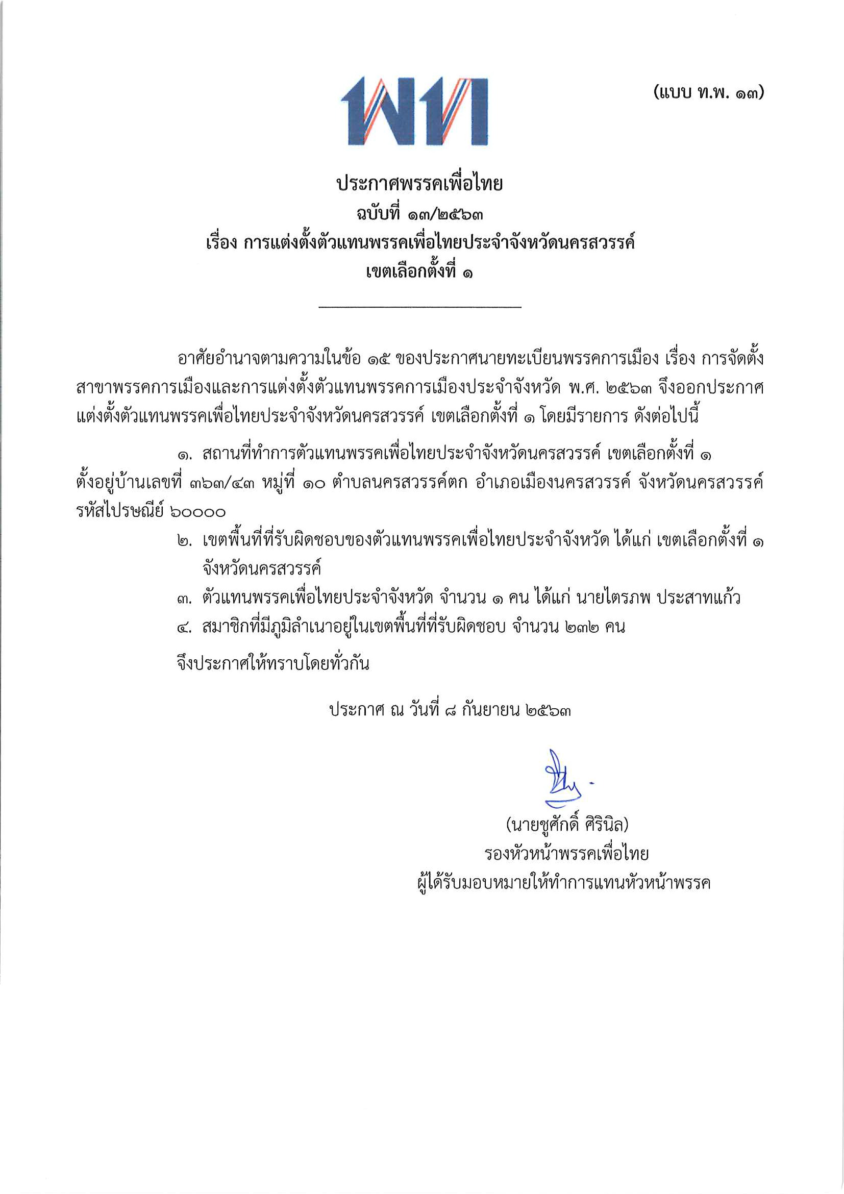 ประกาศพรรคเพื่อไทย ฉบับที่ ๑๓/๒๕๖๓ เรื่อง การแต่งตั้งตัวแทนพรรคเพื่อไทยประจำจังหวัดนครสวรรค์ เขตเลือกตั้งที่ ๑