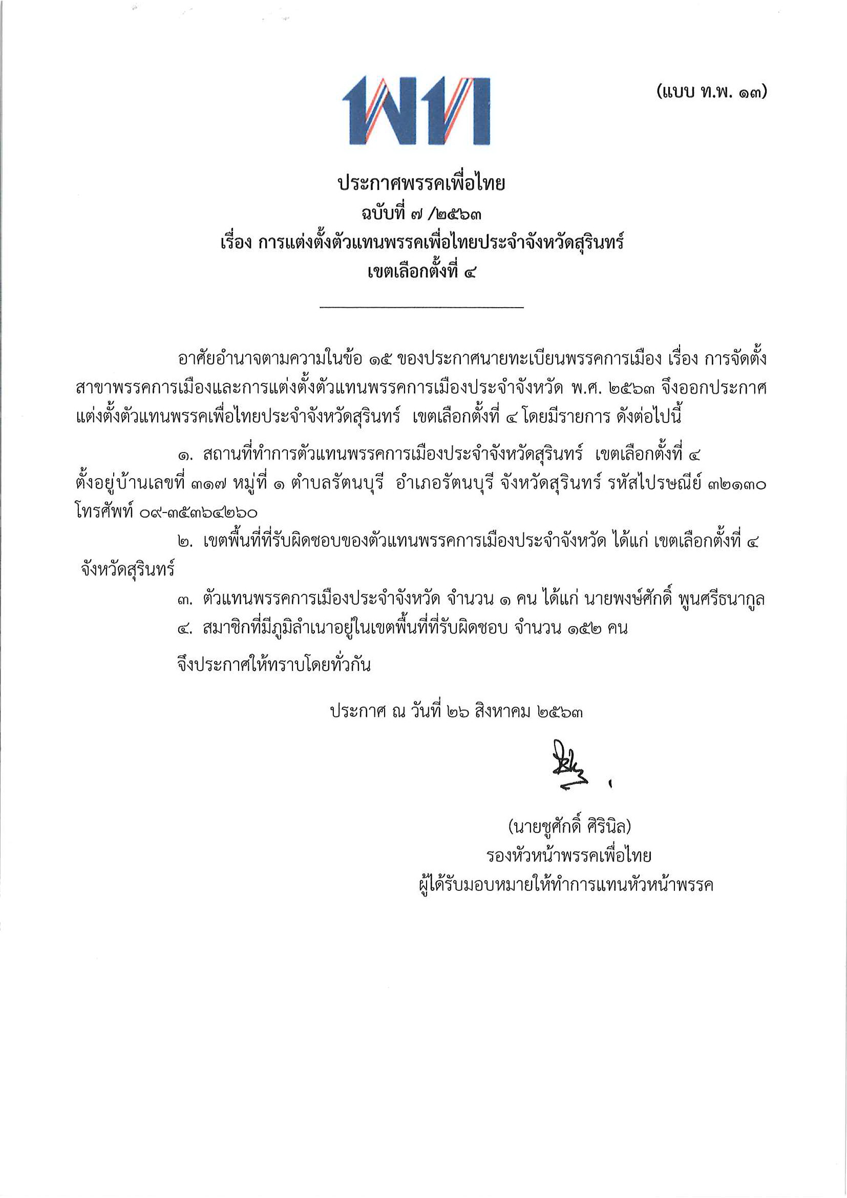 ประกาศพรรคเพื่อไทย ฉบับที่ ๗/๒๕๖๓ เรื่อง การแต่งตั้งตัวแทนพรรคเพื่อไทยประจำจังหวัดสุรินทร์ เขตเลือกตั้งที่ ๔