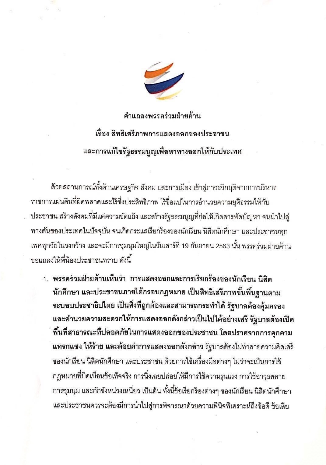 ด้วยสถานการณ์ทั้งด้านเศรษฐกิจ สังคม และการเมือง เข้าสู่ภาวะวิกฤติจากการบริหารราชการแผ่นดินที่ผิดพลาดและไร้ซึ่งประสิทธิภาพ ไร้ขื่อแปในการอำนวยความยุติธรรมให้กับประชาชน สร้างสังคมที่มีแต่ความขัดแย้ง และสร้างรัฐธรรมนูญที่ก่อให้เกิดสารพัดปัญหา จนนำไปสู่ทางตันของประเทศในปัจจุบัน จนเกิดกระแสเรียกร้องของนักเรียน นิสิตนักศึกษา และประชาชนทุกเพศทุกวัยในวงกว้าง และจะมีการชุมนุมใหญ่ในวันเสาร์ที่ 19 กันยายน 2563 นั้น พรรคร่วมฝ่ายค้านขอแถลงให้พี่น้องประชาชนทราบ ดังนี้
