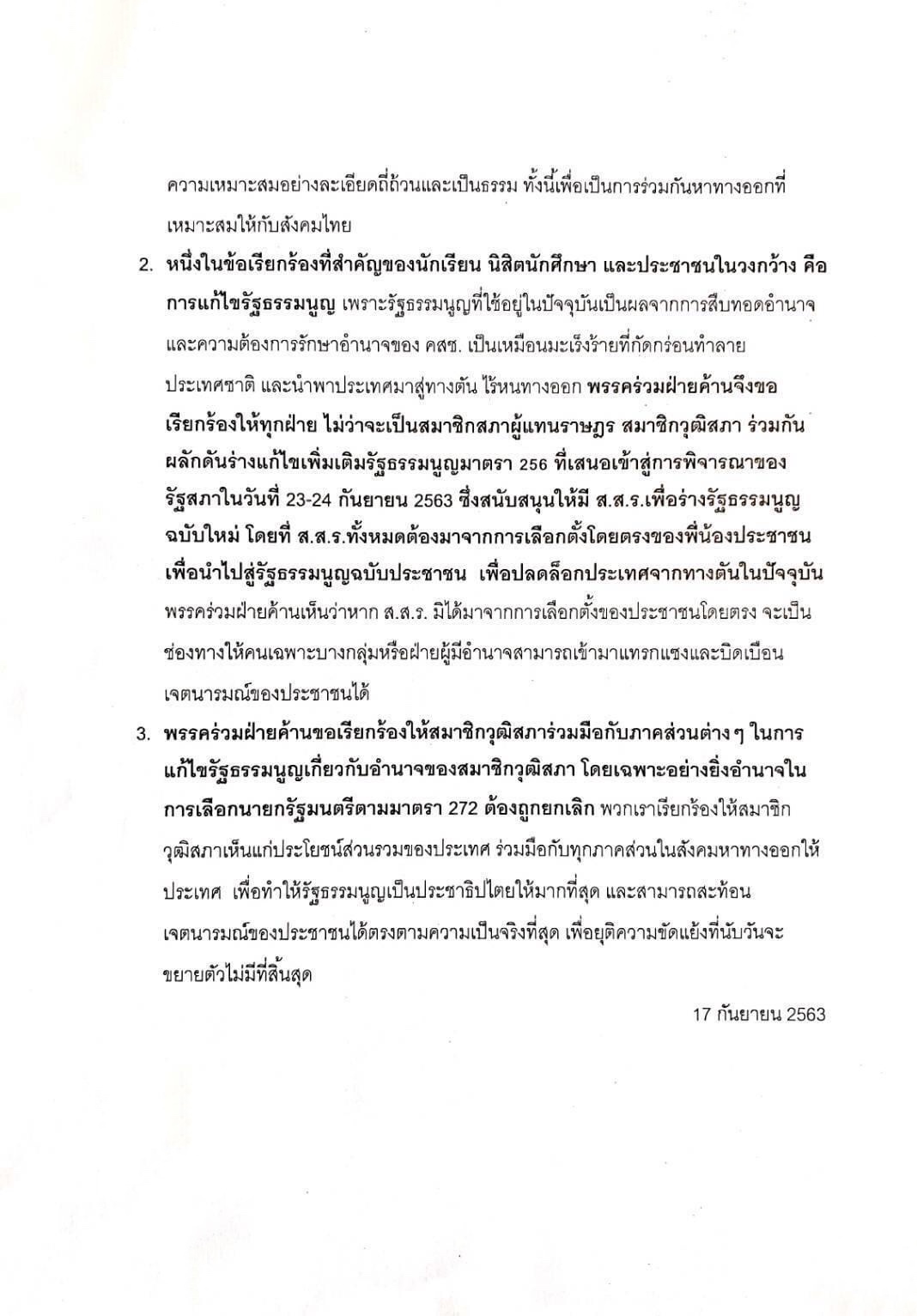 2. หนึ่งในข้อเรียกร้องที่สำคัญของนักเรียน นิสิตนักศึกษา และประชาชนในวงกว้าง คือ การแก้ไขรัฐธรรมนูญ เพราะรัฐธรรมนูญที่ใช้อยู่ในปัจจุบันเป็นผลจากการสืบทอดอำนาจและความต้องการรักษาอำนาจของ คสช. เป็นเหมือนมะเร็งร้ายที่กัดกร่อนทำลายประเทศชาติ และนำพาประเทศมาสู่ทางตัน ไร้หนทางออก พรรคร่วมฝ่ายค้านจึงขอเรียกร้องให้ทุกฝ่าย ไม่ว่าจะเป็นสมาชิกสภาผู้แทนราษฎร สมาชิกวุฒิสภา ร่วมกันผลักดันร่างแก้ไขเพิ่มเติมรัฐธรรมนูญมาตรา 256 ที่เสนอเข้าสู่การพิจารณาของรัฐสภาในวันที่ 23-24 กันยายน 2563 ซึ่งสนับสนุนให้มี ส.ส.ร. เพื่อร่างรัฐธรรมนูญฉบับใหม่ โดยที่ ส.ส.ร. ทั้งหมดต้องมาจากการเลือกตั้งโดยตรงของพี่น้องประชาชน เพื่อนำไปสู่รัฐธรรมนูญฉบับประชาชน เพื่อปลดล็อกประเทศจากทางตันในปัจจุบัน พรรคร่วมฝ่ายค้านเห็นว่าหาก ส.ส.ร. มิได้มาจากการเลือกตั้งของประชาชนโดยตรง จะเป็นช่องทางให้คนเฉพาะบางกลุ่ม หรือฝ่ายผู้มีอำนาจสามารถเข้ามาแทรกแซงและบิดเบือนเจตนารมณ์ของประชาชนได้