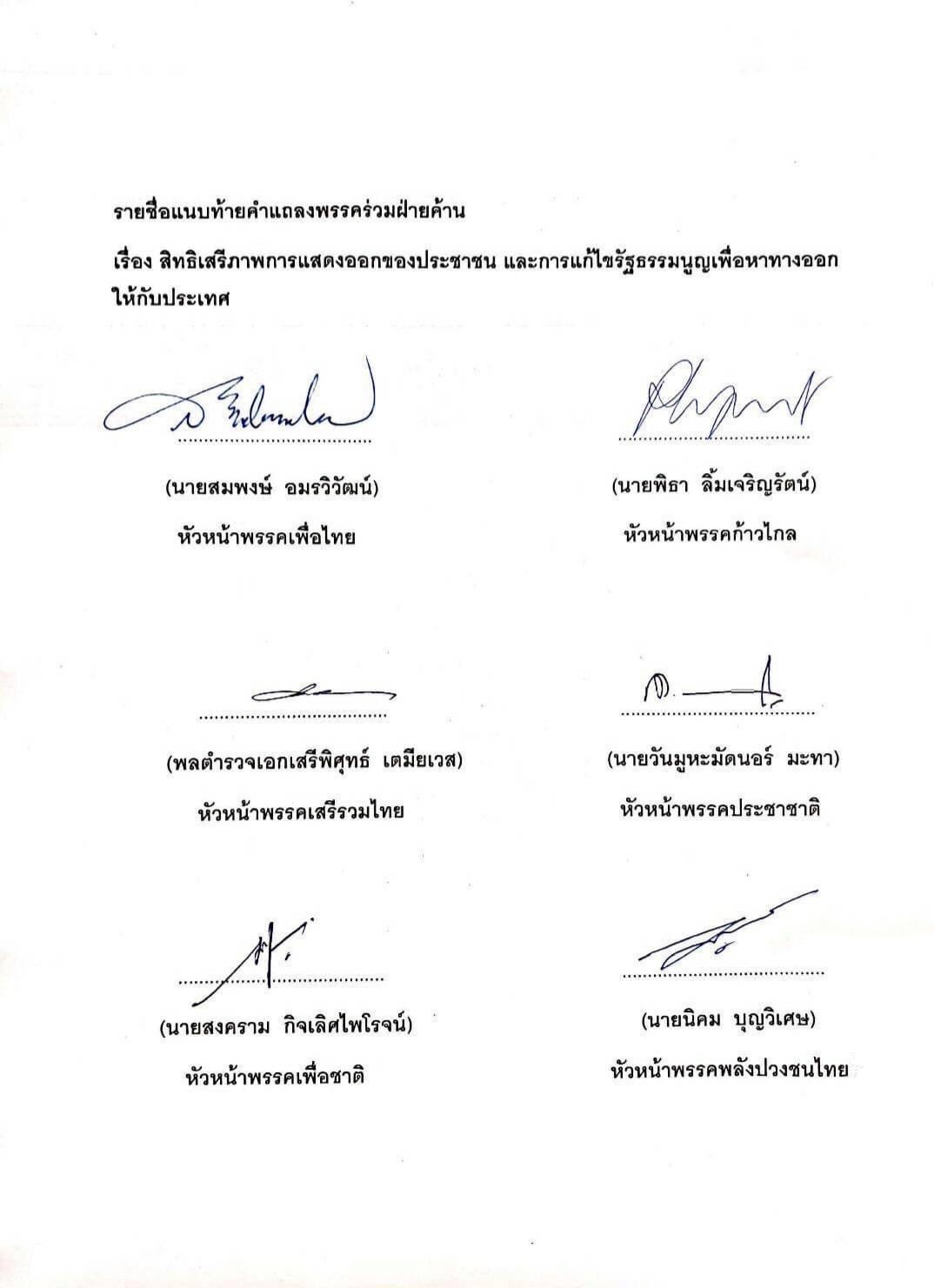 1. พรรคร่วมฝ่ายค้านเห็นว่า การแสดงออกและการเรียกร้องของนักเรียน นิสิตนักศึกษา และประชาชนภายใต้กรอบกฎหมาย เป็นสิทธิเสรีภาพขั้นพื้นฐานตามระบอบประชาธิปไตย เป็นสิ่งที่ถูกต้องและสามารถกระทำได้ รัฐบาลต้องคุ้มครองและอำนวยความสะดวกให้การแสดงออกดังกล่าวเป็นไปได้อย่างเสรี รัฐบาลต้องเปิดพื้นที่สาธารณะที่ปลอดภัยในการแสดงออกของประชาชน โดยปราศจากการคุกคาม แทรกแซง ให้ร้าย และด้อยค่าการแสดงออกดังกล่าว รัฐบาลต้องไม่ทำลายความคิดเสรีของนักเรียน นิสิตนักศึกษา และประชาชน ด้วยการใช้เครื่องมือต่างๆ ไม่ว่าจะเป็นการใช้กฎหมายที่บิดเบือนข้อเท็จจริง การนิ่งเฉยปล่อยให้มีการใช้ความรุนแรง การใช้อาวุธสลายการชุมนุม และกักขังหน่วงเหนี่ยว เป็นต้น ทั้งนี้ข้อเรียกร้องต่างๆ ของนักเรียน นิสิตนักศึกษา และประชาชนควรจะต้องมีการนำไปสู่การพิจารณาด้วยความพินิจพิเคราะห์ถึงข้อดีข้อเสีย ความเหมาะสมอย่างละเอียดถี่ถ้วนและเป็นธรรม ทั้งนี้เพื่อเป็นการร่วมกันหาทางออกที่เหมาะสมให้กับสังคมไทย