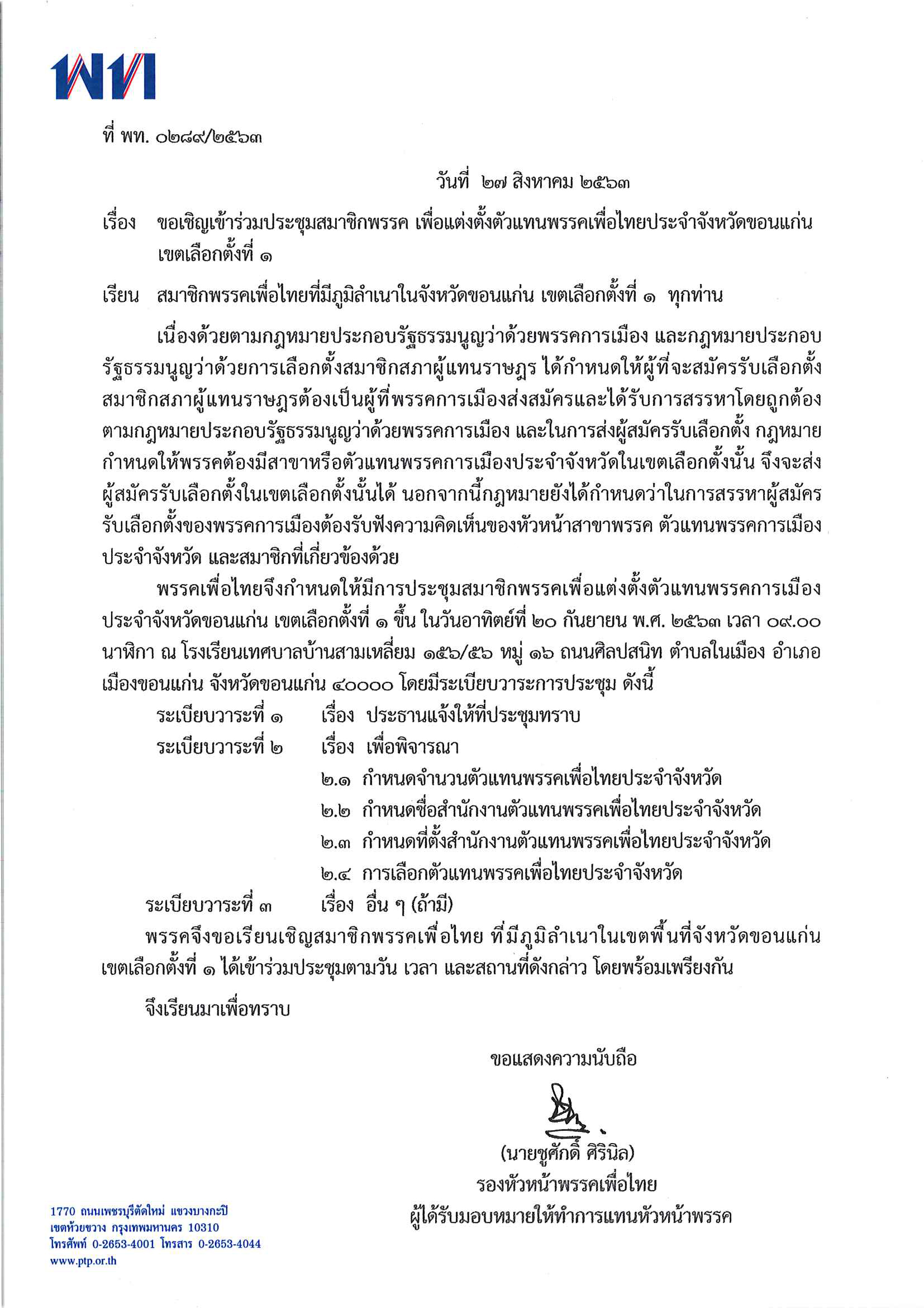 ขอเชิญเข้าร่วมประชุมสมาชิกพรรค เพื่อแต่งตั้งตัวแทนพรรคการเมืองประจำจังหวัดขอนแก่น เขตเลือกตั้งที่ ๑