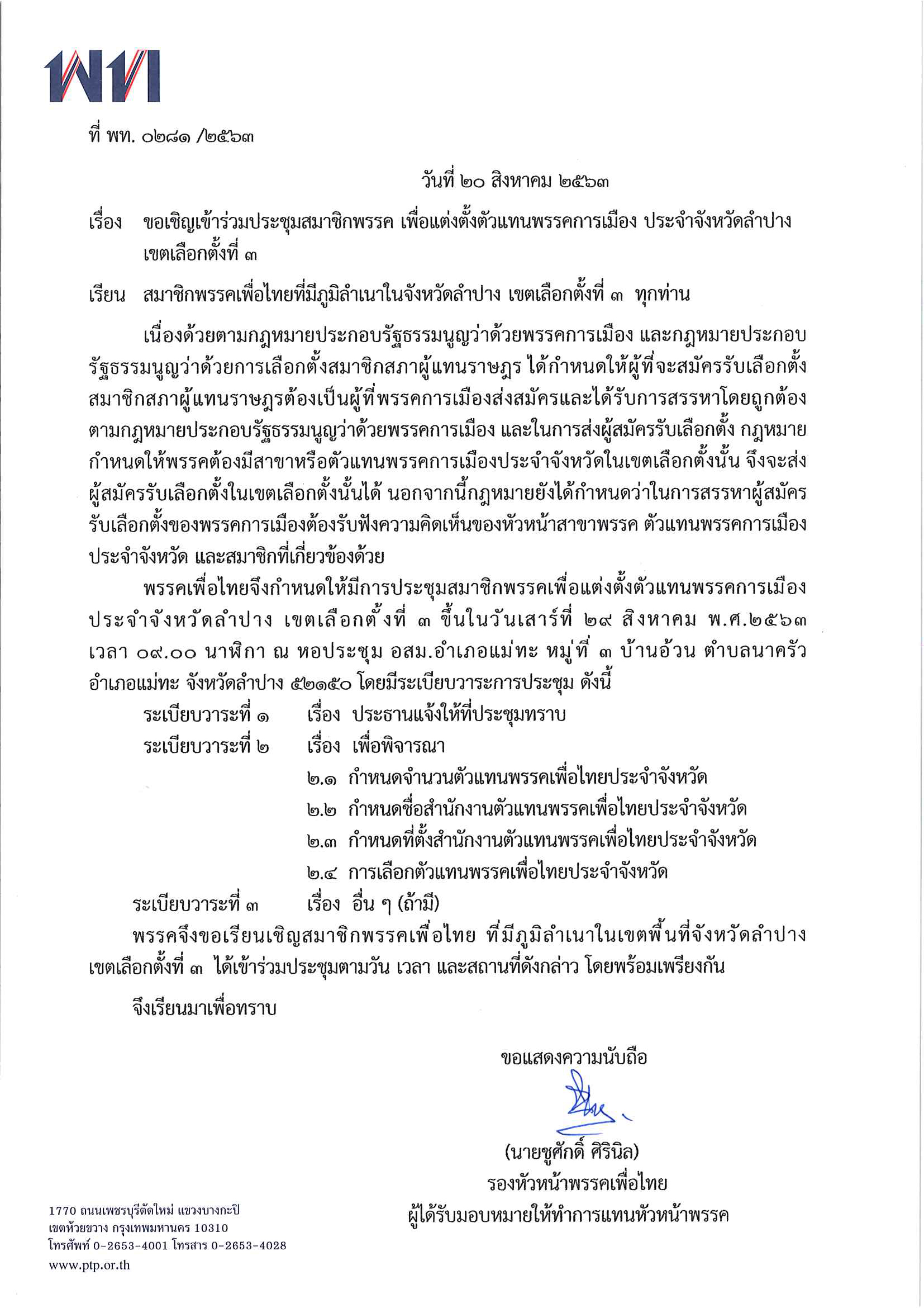 ขอเชิญเข้าร่วมประชุมสมาชิกพรรค เพื่อแต่งตั้งตัวแทนพรรคการเมืองประจำจังหวัดลำปาง เขตเลือกตั้งที่ ๓