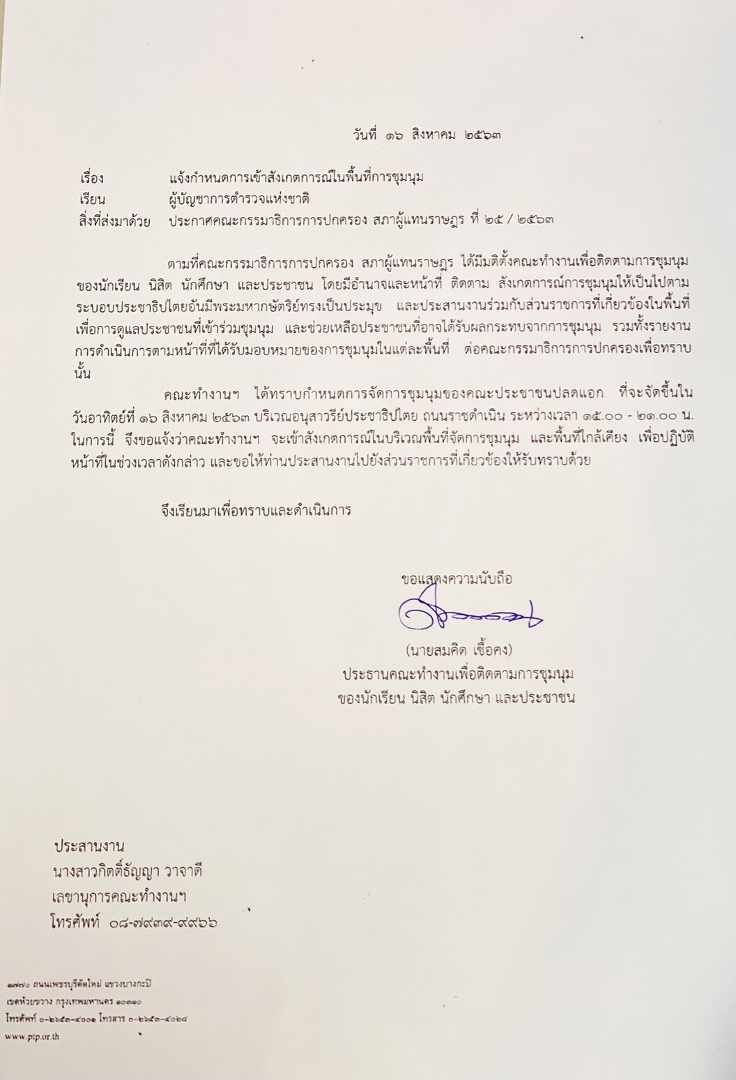 ขณะที่ นายอนุสรณ์ เปิดเผยว่า คณะทำงานเพื่อติดตามการชุมนุมของกลุ่มนักเรียน นิสิต นักศึกษา และประชาชน ในคณะกรรมาธิการการปกครอง สภาผู้แทนราษฎร ได้ส่งหนังสือไปยัง ผบ.ตร. ลงวันที่ 16 สิงหาคม 2563 เพื่อขอประสานเข้าพื้นที่สังเกตการณ์การชุมนุมของกลุ่มนักเรียน นิสิต นักศึกษา และประชาชน ที่บริเวณอนุสาวรีย์ประชาธิปไตย และขอให้ ผบ.ตร. ประสานหน่วยงานต่างๆ ให้อำนวยความสะดวกในการทำหน้าที่ต่อไป