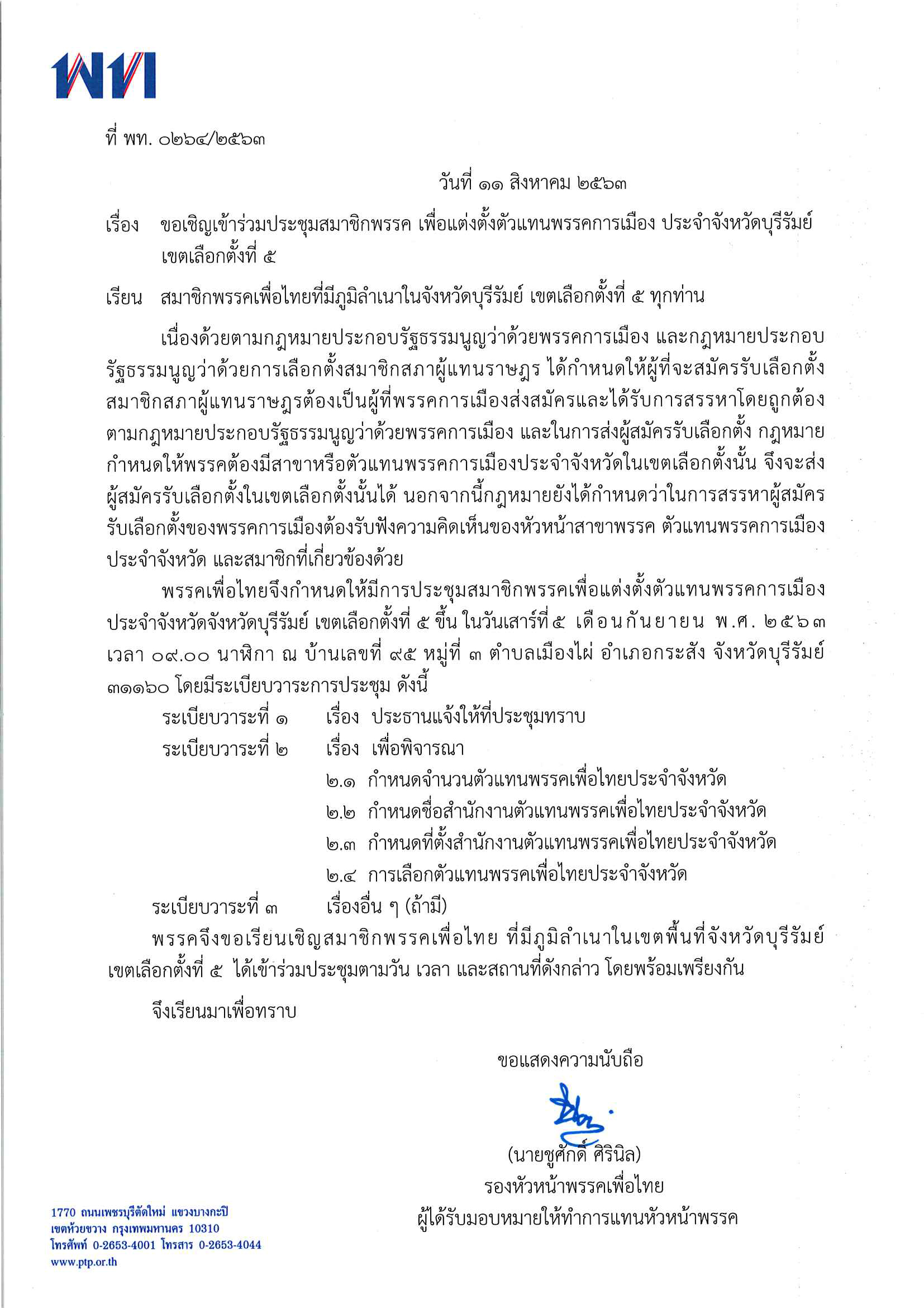 ขอเชิญเข้าร่วมประชุมสมาชิกพรรค เพื่อแต่งตั้งตัวแทนพรรคการเมืองประจำจังหวัดบุรีรัมย์ เขตเลือกตั้งที่ ๕