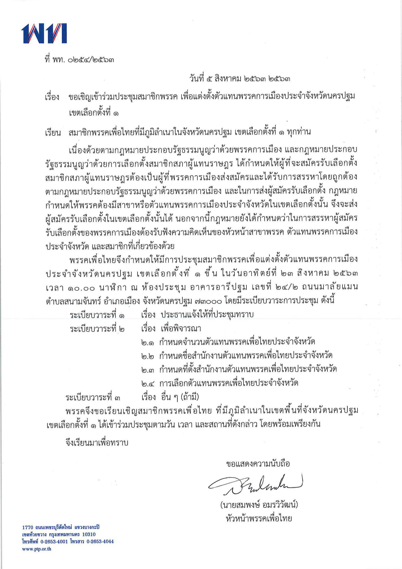 ขอเชิญเข้าร่วมประชุมสมาชิกพรรค เพื่อแต่งตั้งตัวแทนพรรคการเมืองประจำจังหวัดนครปฐม เขตเลือกตั้งที่ ๑