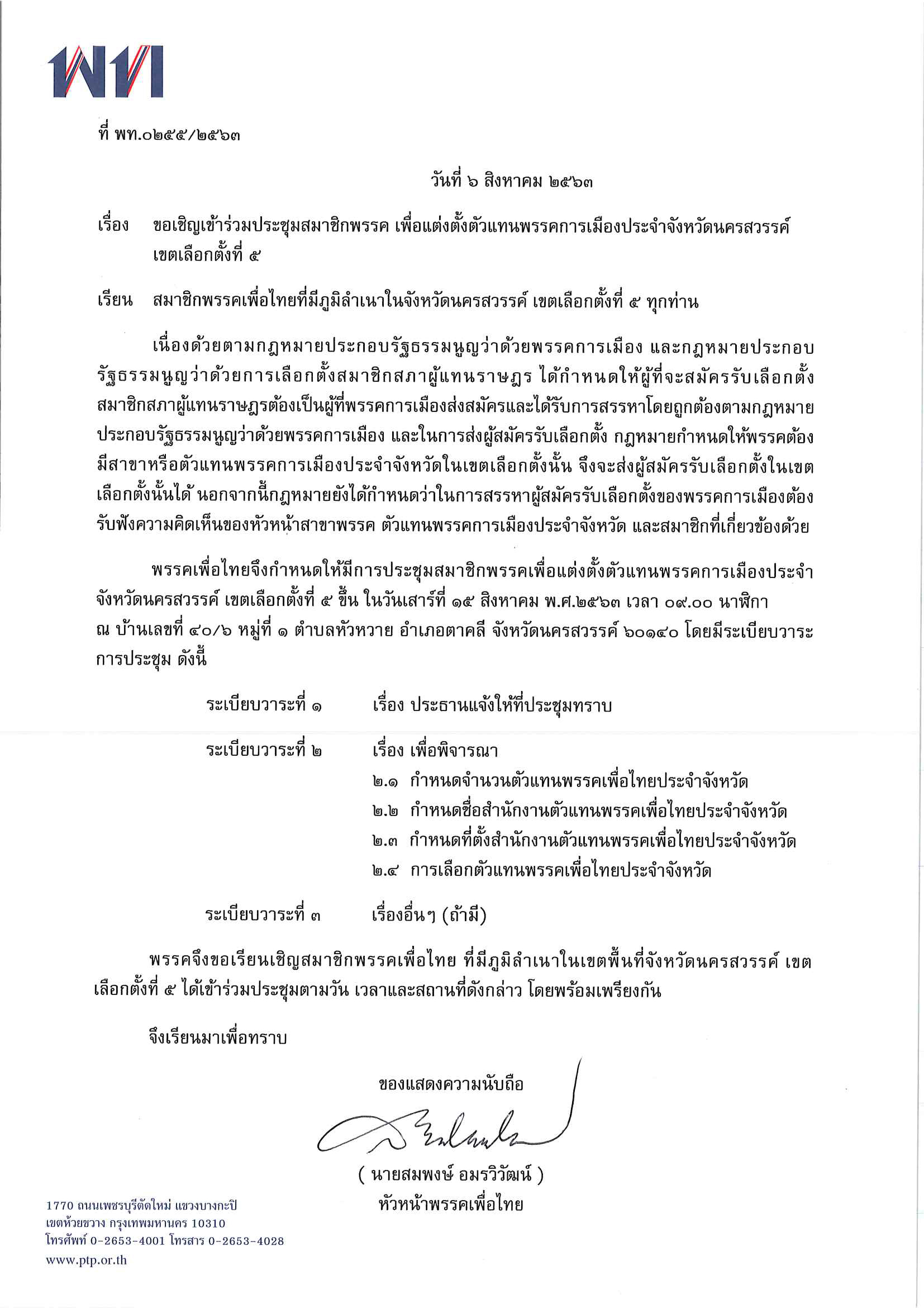 ขอเชิญเข้าร่วมประชุมสมาชิกพรรค เพื่อแต่งตั้งตัวแทนพรรคการเมืองประจำจังหวัดนครสวรรค์ เขตเลือกตั้งที่ ๕