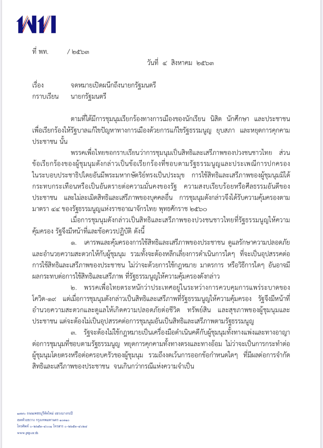 “พรรคเพื่อไทย” ยื่นจดหมายเปิดผนึกถึงนายกรัฐมนตรี เรียกร้องรัฐบาลเคารพสิทธิเสรีภาพตามรัฐธรรมนูญ หลีกเลี่ยงการคุกคามนักศึกษาและประชาชน