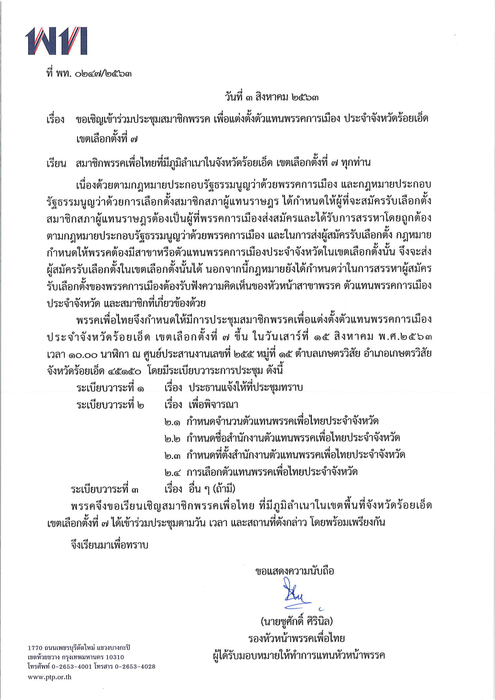 ขอเชิญเข้าร่วมประชุมสมาชิกพรรค เพื่อแต่งตั้งตัวแทนพรรคการเมืองประจำจังหวัดร้อยเอ็ด เขตเลือกตั้งที่ ๗