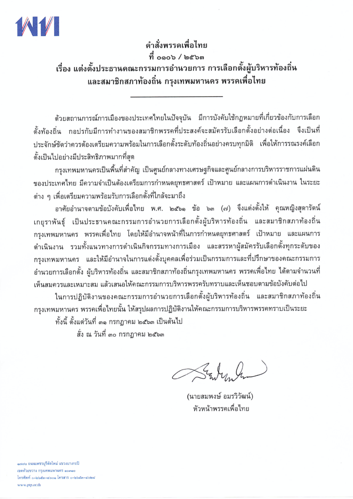 ทั้งนี้ นายสมพงษ์ อมรวิวัฒน์ หัวหน้าพรรคเพื่อไทย ได้ลงนาม คำสั่งพรรคเพื่อไทย ที่ 0106/2563 เมื่อวันที่ 30 กรกฎาคม 2563 แต่งตั้งให้คุณหญิงสุดารัตน์ เกยุราพันธุ์ เป็นประธานคณะกรรมการอำนวยการเลือกตั้งผู้บริหารท้องถิ่นและสมาชิกสภาท้องถิ่นกรุงเทพมหานคร พรรคเพื่อไทย โดยให้มีอำนาจหน้าที่ในการกำหนดยุทธศาสตร์ เป้าหมาย และแผนการดำเนินงาน รวมทั้งแนวทางดำเนินกิจกรรมทางการเมือง และสรรหาผู้สมัครรับเลือกตั้งทุกระดับของกรุงเทพมหานคร และให้มีอำนาจในการแต่งตั้งบุคคลเพื่อร่วมเป็นกรรมการและที่ปรึกษาของคณะกรรมการอำนวยการเลือกตั้ง ผู้บริหารท้องถิ่น และสมาชิกสภาท้องถิ่นกรุงเทพมหานคร พรรคเพื่อไทย แล้วเสนอให้คณะกรรมการบริหารพรรครับทราบและเห็นชอบตามข้อบังคับ
