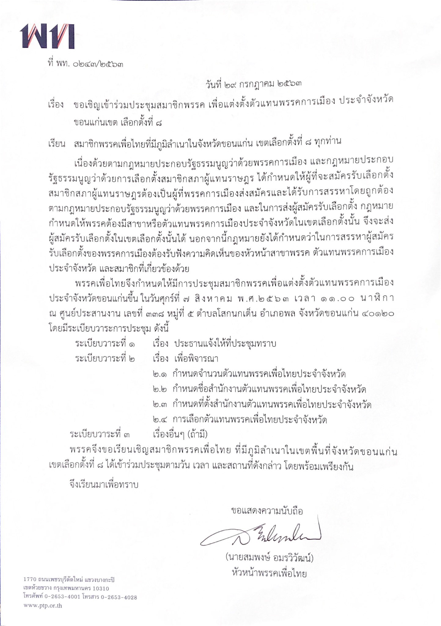 ขอเชิญเข้าร่วมประชุมสมาชิกพรรค เพื่อแต่งตั้งตัวแทนพรรคการเมือง ประจำจังหวัดขอนแก่น เขตเลือกตั่งที่ ๘