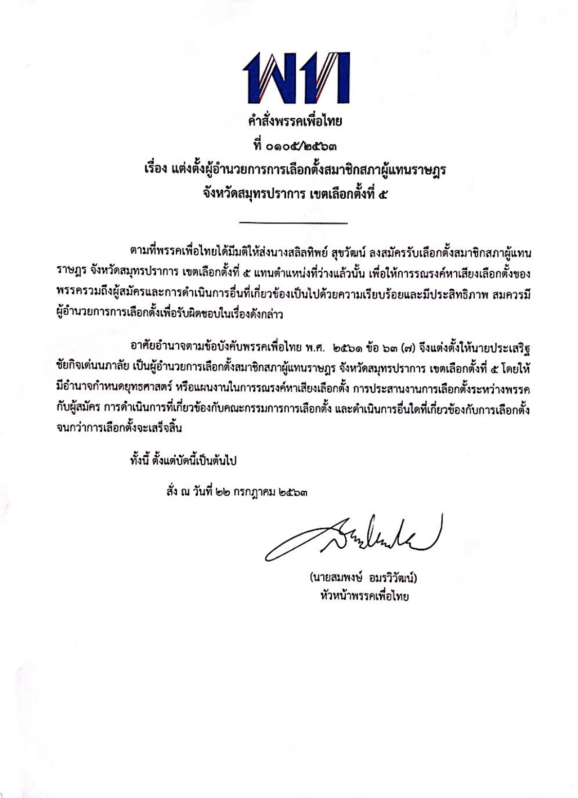 23 กรกฎาคม 2563 นายอนุสรณ์ เอี่ยมสะอาด โฆษกพรรคเพื่อไทย กล่าวว่า ตามที่พรรคเพื่อไทยได้มีมติส่ง นางสลิลทิพย์ สุขวัฒน์ ลงสมัครรับเลือกตั้งสมาชิกสภาผู้แทนราษฎร จังหวัดสมุทรปราการ เขตเลือกตั้งที่ 5 แทนตำแหน่งที่ว่าง เพื่อให้การรณรงค์หาเสียงเลือกตั้งของพรรครวมถึงผู้สมัคร และการดำเนินการอื่นที่เกี่ยวข้อง เป็นไปด้วยความเรียบร้อยและมีประสิทธิภาพ จึงแต่งตั้งให้ นายประเสริฐ ชัยกิจเด่นนภาลัย เป็นผู้อำนายการเลือกตั้ง สมาชิกสภาผู้แทนราษฎร จังหวัดสมุทรปราการ เขตเลือกตั้งที่ 5 ลงนามโดย นายสมพงษ์ อมรวิวัฒน์ หัวหน้าพรรคเพื่อไทย