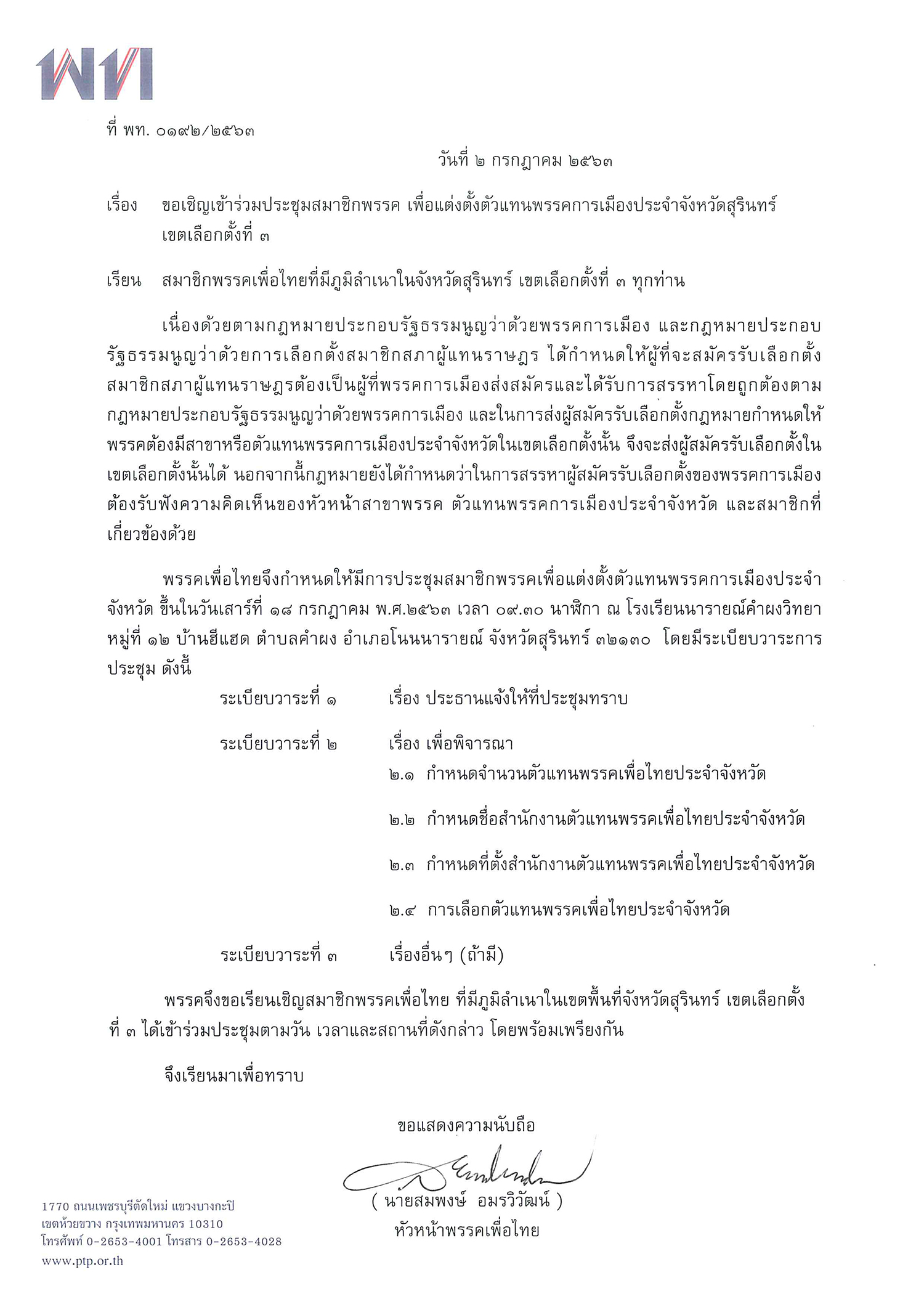 ขอเชิญเข้าร่วมประชุมสมาชิกพรรค เพื่อแต่งตั้งตัวแทนพรรคการเมืองประจำจังหวัดสุรินทร์ เขตเลือกตั้งที่ ๓