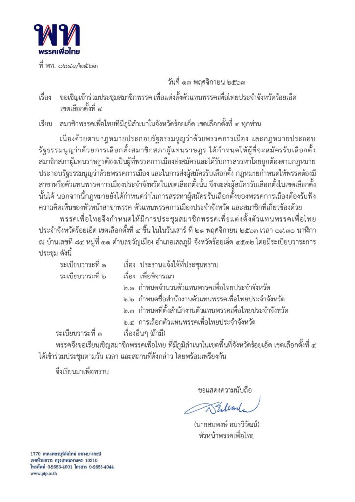 ขอเชิญเข้าร่วมประชุมสมาชิกพรรค เพื่อแต่งตั้งตัวแทนพรรคเพื่อไทยประจำจังหวัดร้อยเอ็ด เขตเลือกตั้งที่ ๔