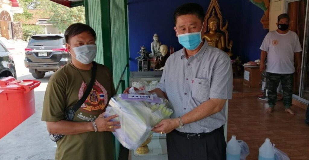 นายมนตรี ตั้งเจริญถาวร ส.ส.นนทบุรี พรรคเพื่อไทย มอบถังพ่นพร้อมน้ำยาฆ่าเชื้อ หน้ากากอนามัย และเจลแอลกอฮอล์ ให้กับกำนัน-ผู้ใหญ่บ้าน อ.ปากเกร็ด จ.นนทบุรี