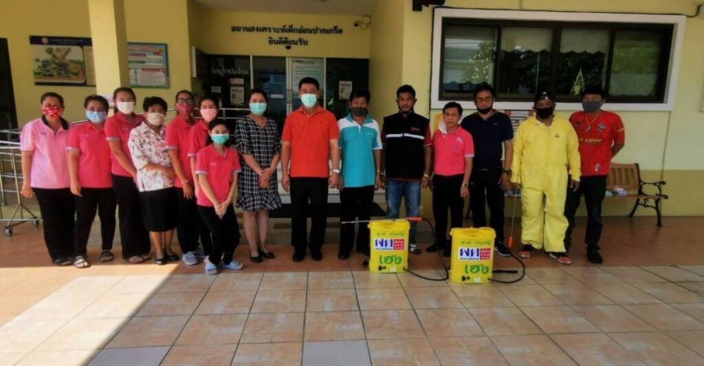 นายมนตรี ตั้งเจริญถาวร ส.ส.นนทบุรี พรรคเพื่อไทย มอบถังฉีดพ่นน้ำยาฆ่าเชื้อโรค เจลแอลกอฮอล์ และหน้ากากอนามัยให้แก่กำนัน-ผู้ใหญ่บ้าน ต.คลองข่อย
