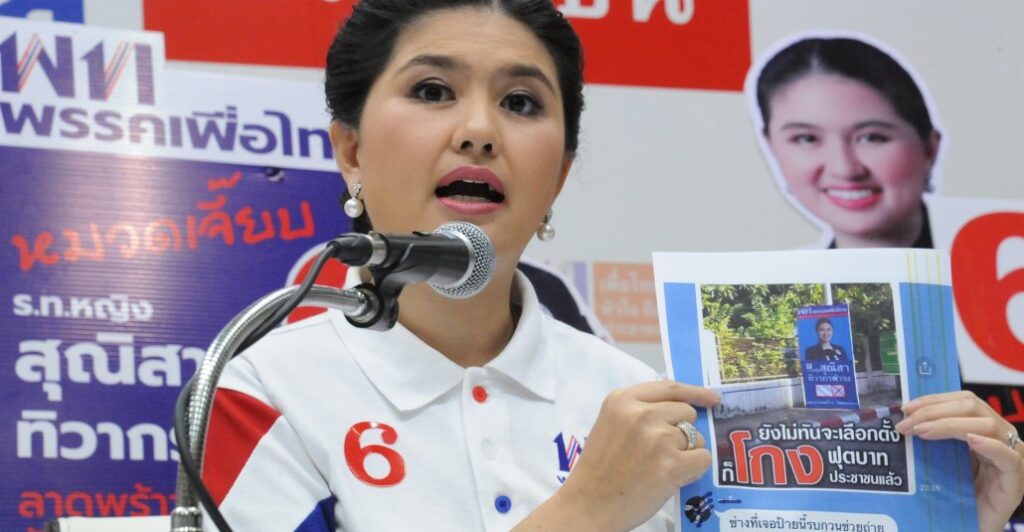 ร.ท.หญิง สุณิสา ทิวากรดํารง ผู้สมัครส.ส.เขตลาดพร้าว วังทองหลาง พรรคเพื่อไทย แถลงข่าว ถูกโจมตีกลั่นแกล้งการติดป้ายหาเสียงในพื้นที่ ณ พรรคเพื่อไทย