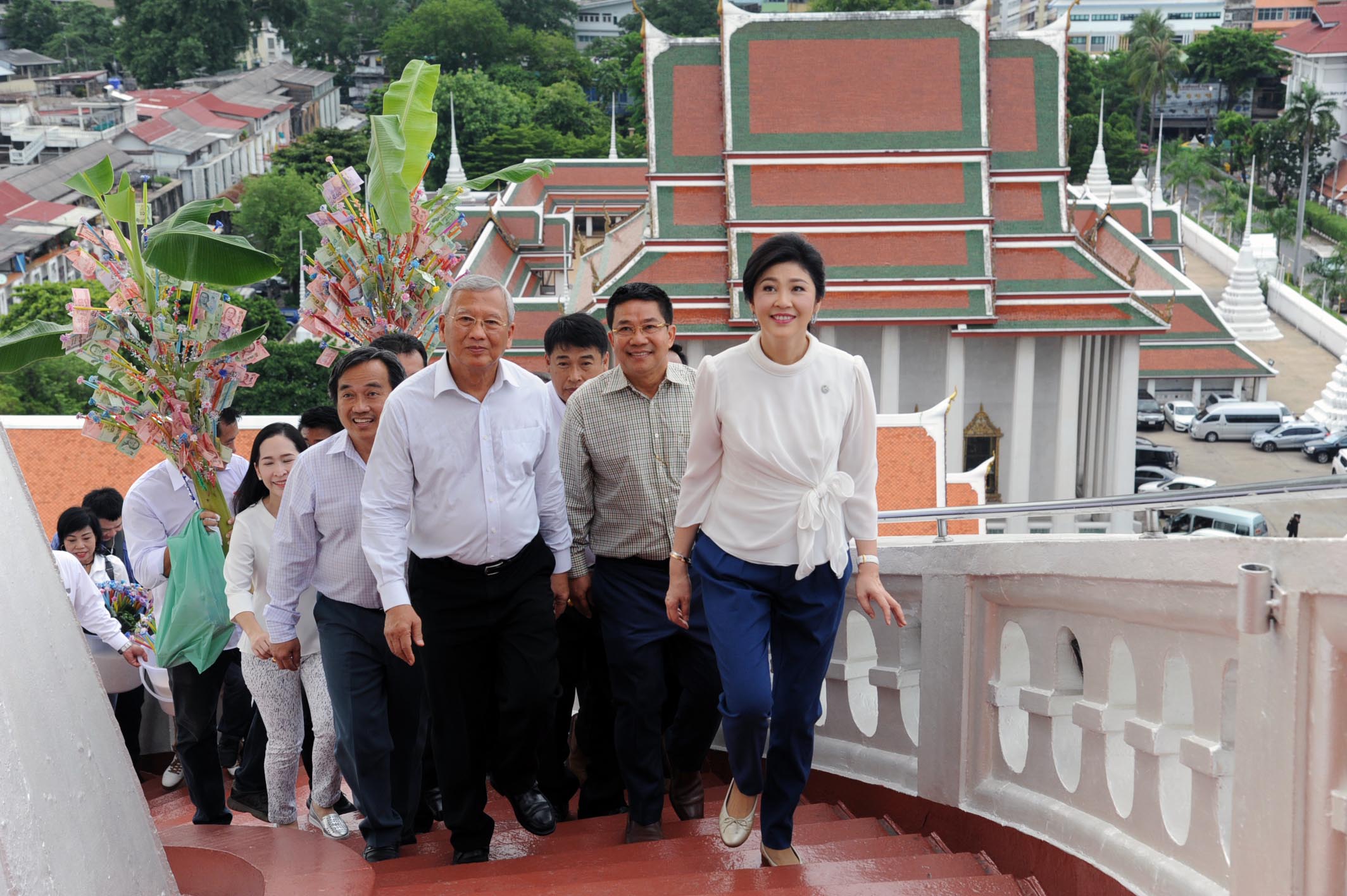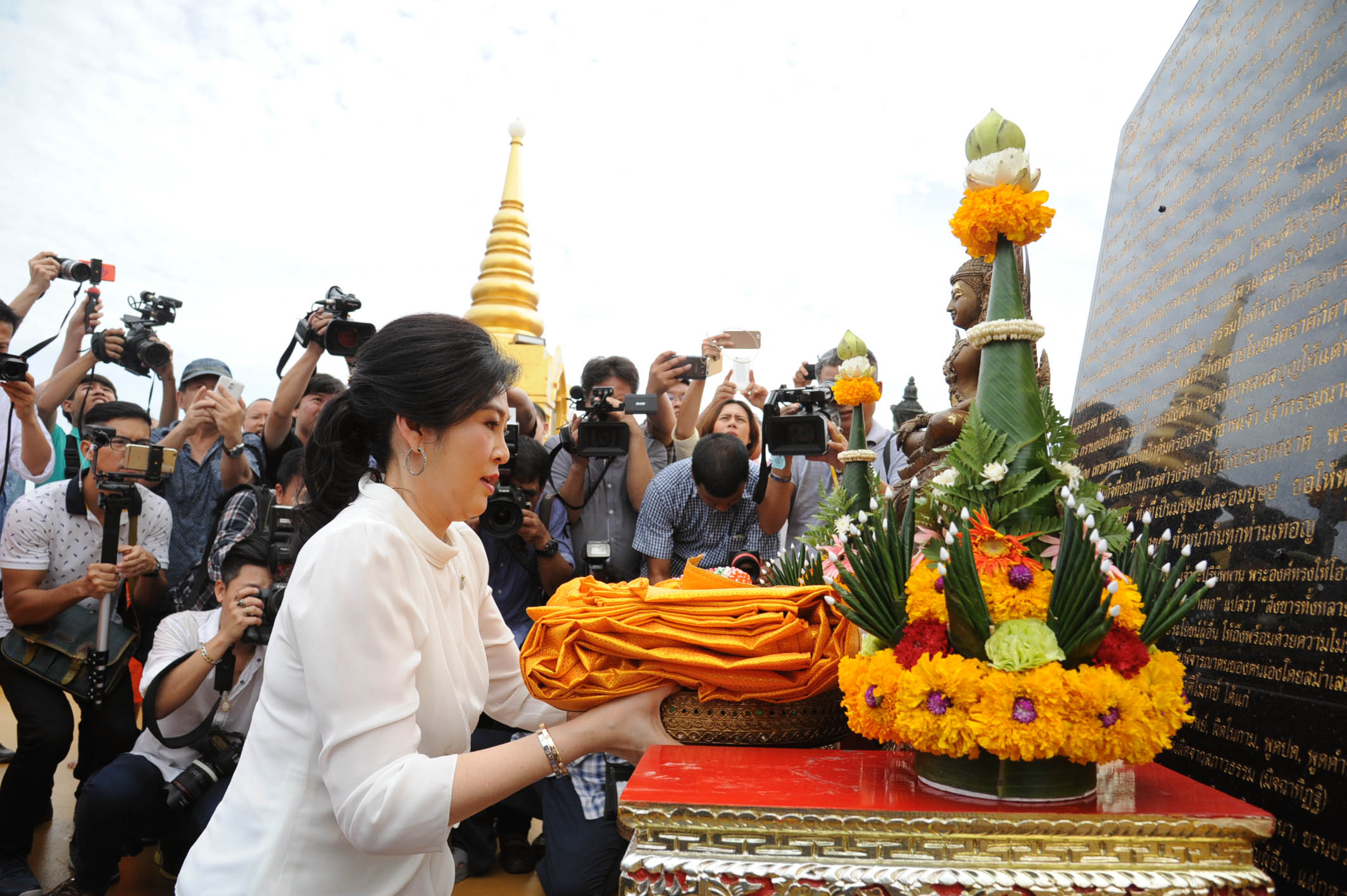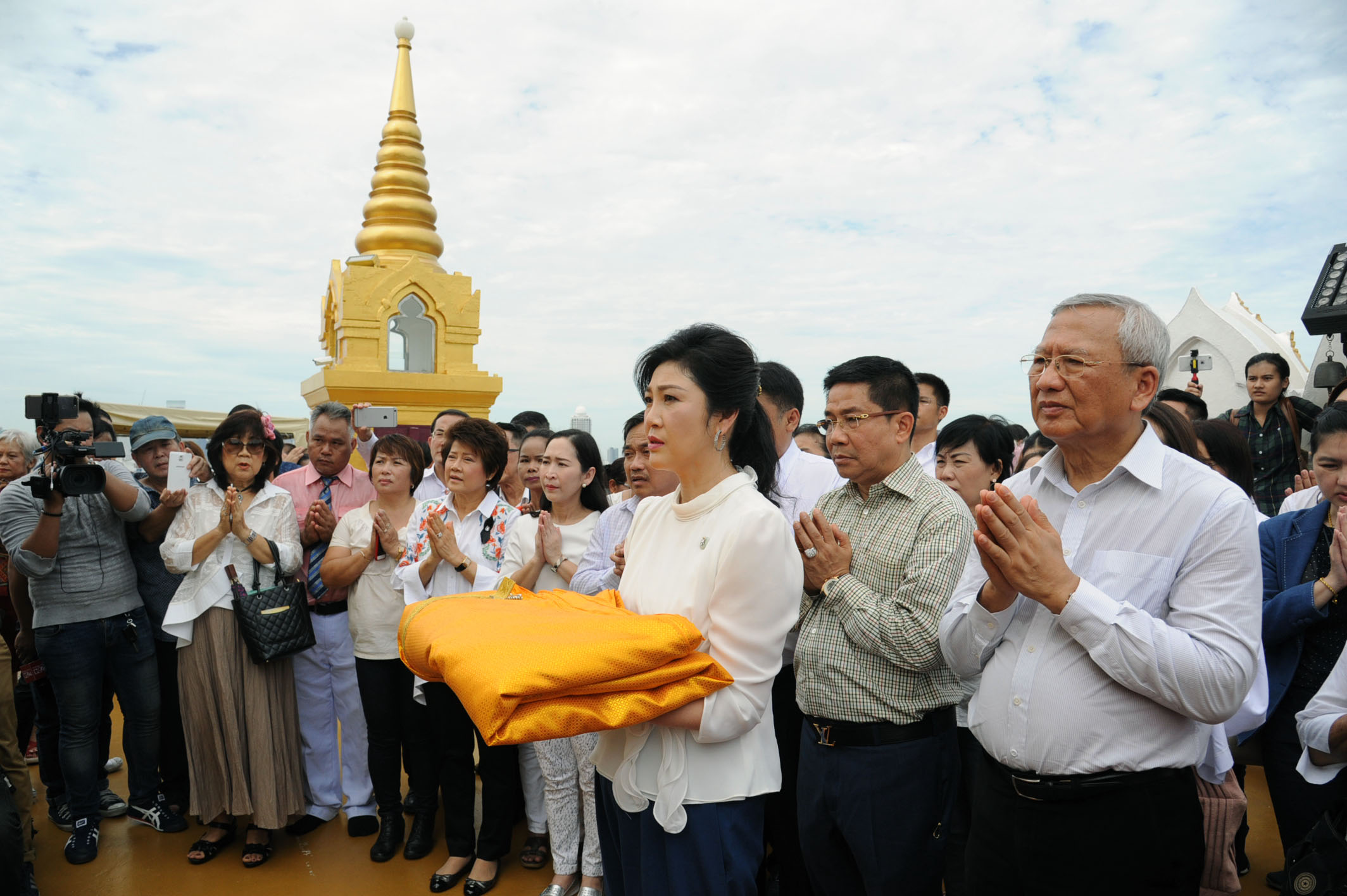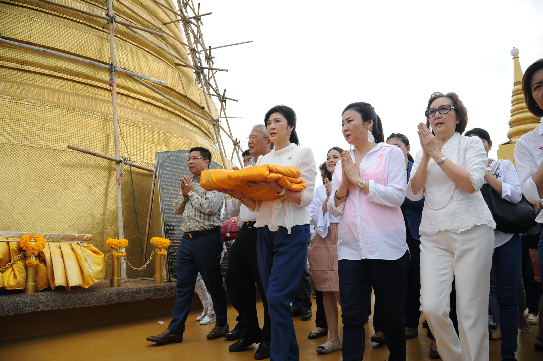 นางสาวยิ่งลักษณ์ ชินวัตร อดีตนายกรัฐมนตรี ทำบุญเนื่องในวันคล้ายวันเกิด ครบรอบ 50 ปี โดยการถวายสังฆทานห่มผ้าองค์พระธาตุ พร้อมถวายผ้าป่า ที่วัดสระเกศ
