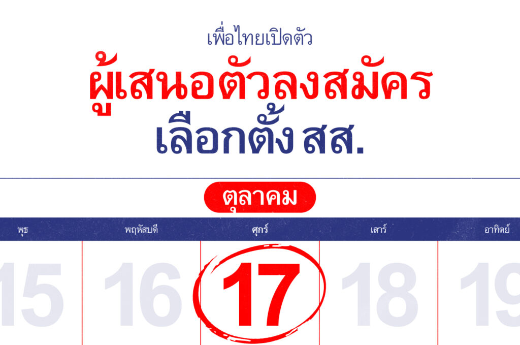 พรรคเพื่อไทยขอเชิญชวนพี่น้องประชาชนทุกท่านร่วมติดตามการเปิดตัวผู้เสนอตัวลงสมัครลงเลือกตั้ง สส. วันศุกร์ที่ 17 ตุลาคมนี้เวลา 10:00 น. เป็นต้นไป