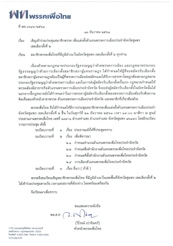 เชิญเข้าร่วมประชุมสมาชิกพรรคเพื่อแต่งตั้งตัวแทนสมาชิกพรรคการเมืองประจำจังหวัดชุมพร เขตเลือกตั้งที่ 2